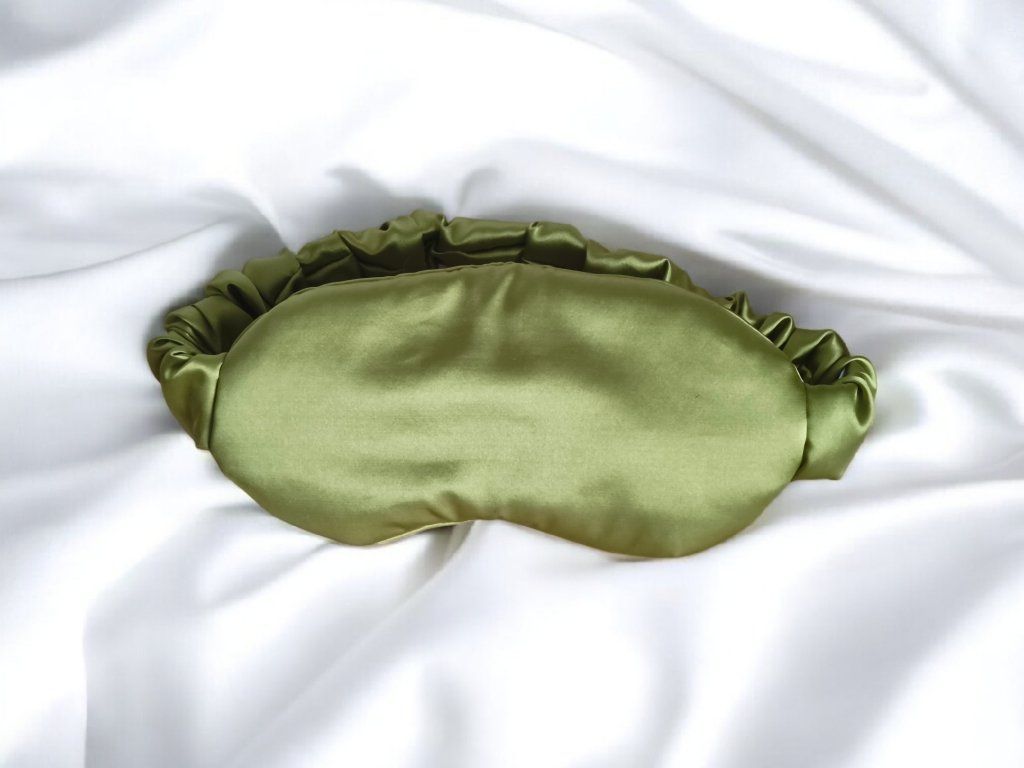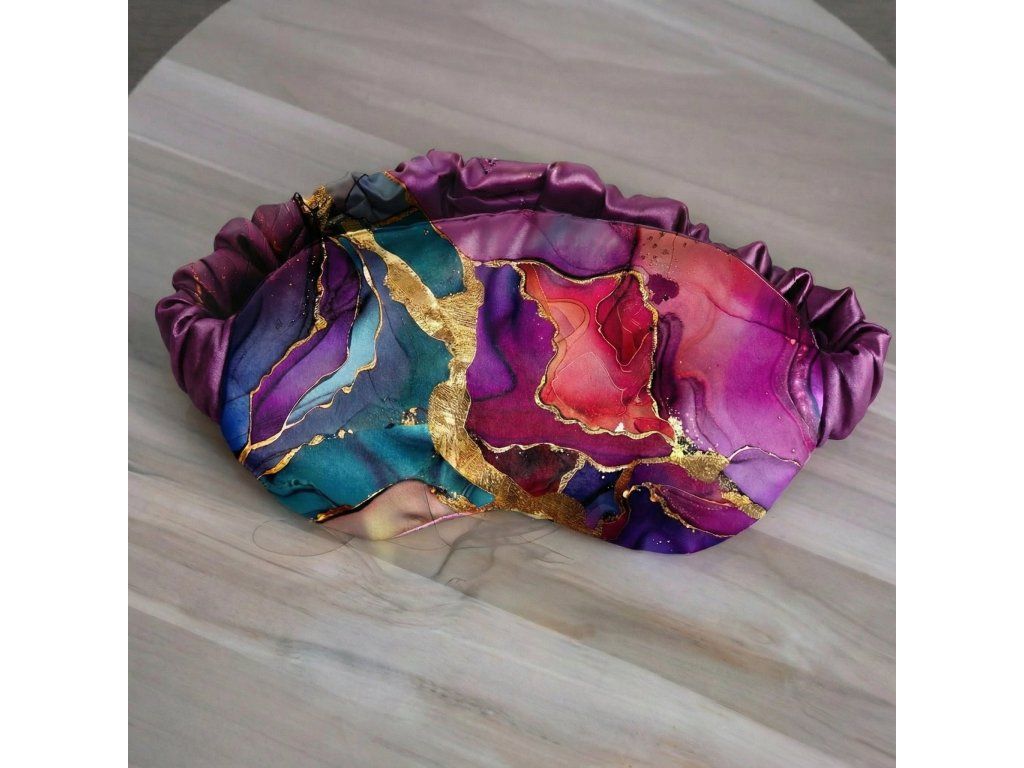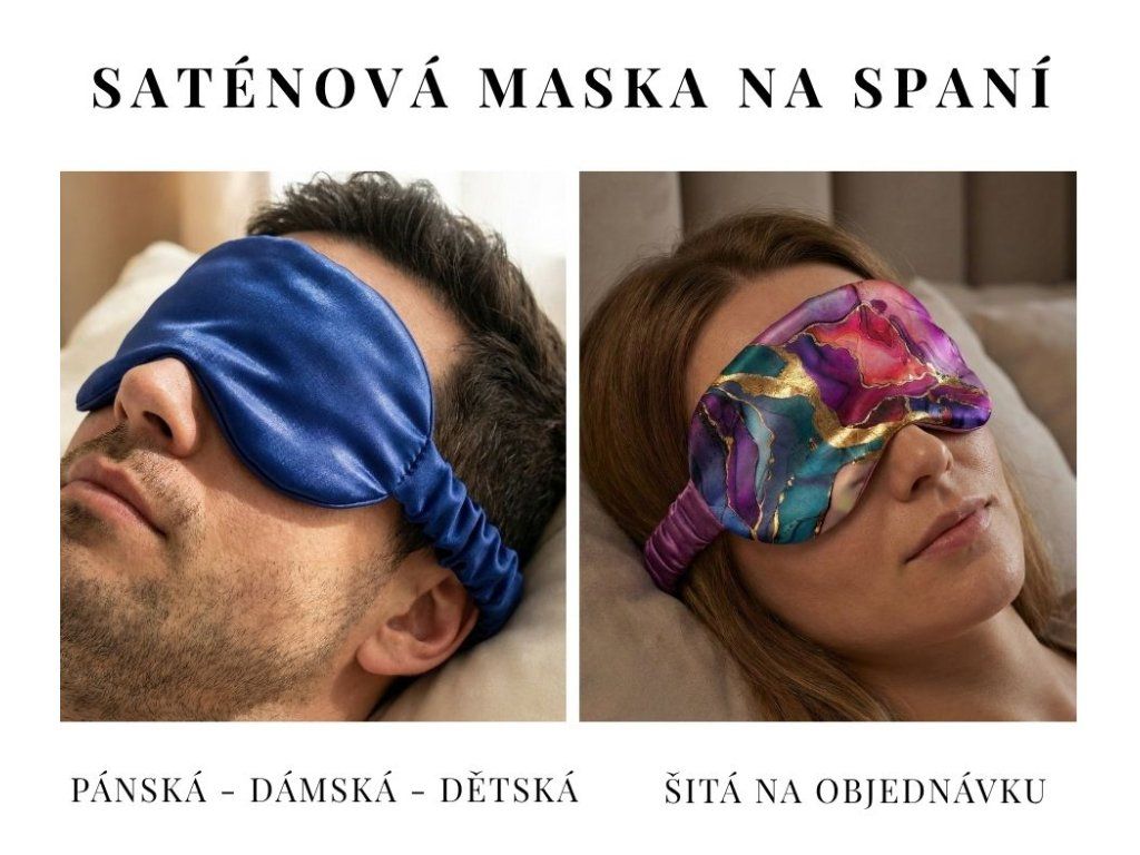 Saténová maska na spaní šitá na míru konkrétní hlavě. Díky vnitřní výplni nepropouští světlo a pomáhá vytvořit klidné podmínky pro spánek.