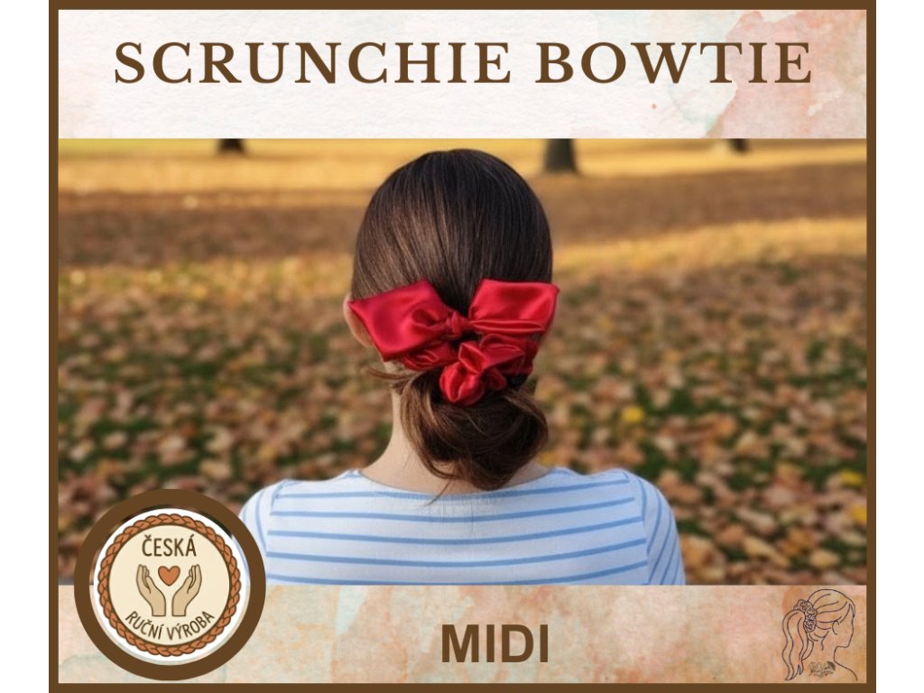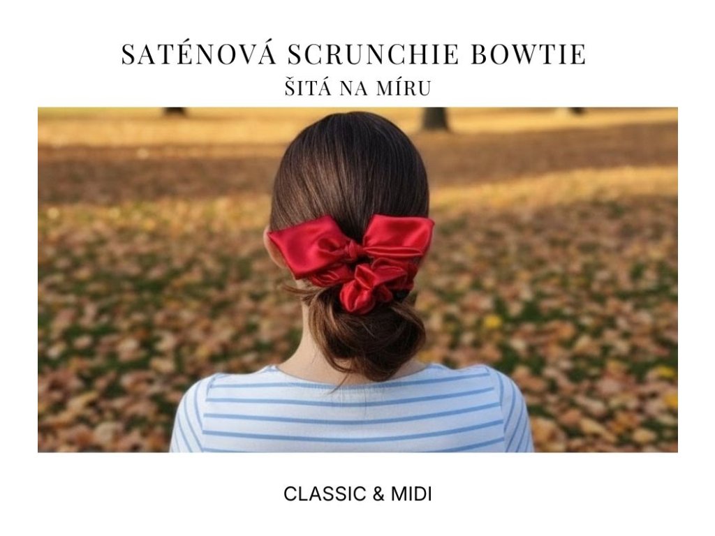 Scrunchie BowTIE je originální scrunchie s přidanou, zkrácenou mašličkou, která dodá vašemu účesu elegantní a hravý šmrnc. Každý kousek je ručně šitý v České republice z kvalitního saténu, který je šetrný k vlasům a dodává účesu elegantní vzhled.